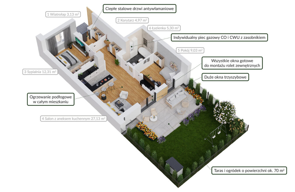 Indywidualny ogród przynależny do każdego apartamentu (także tych na piętrze)