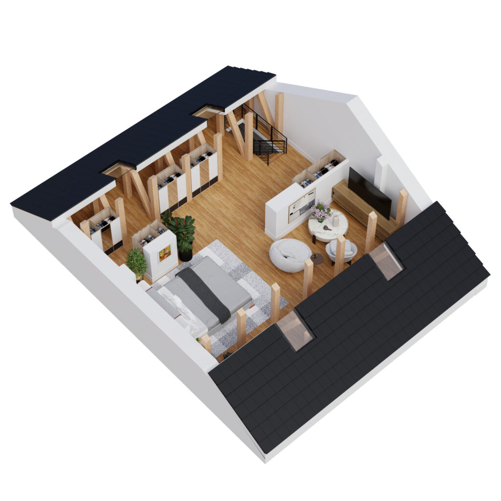 Kupując mieszkanie na piętrze zyskujesz dodatkowe metry kwadratowe powierzchni nieużytkowej, którą w razie potrzeby będziesz mógł we własnym zakresie dodatkowo zaaranżować np. na gabinet czy dodatkową sypialnię. Zmiany będą możliwe po uzyskaniu pozwolenia na użytkowanie. Konstrukcja stropu i dachu jest zaprojektowana w taki sposób, aby bezproblemowo zamienić wyłaz strychowy na schody, a w dachu zamontować dodatkowe okna połaciowe. Powierzchnia poddasza nieużytkowego po podłodze to ponad 70 m², co umożliwi Ci wygospodarowanie nawet ponad 35 m² dodatkowej powierzchni użytkowej.