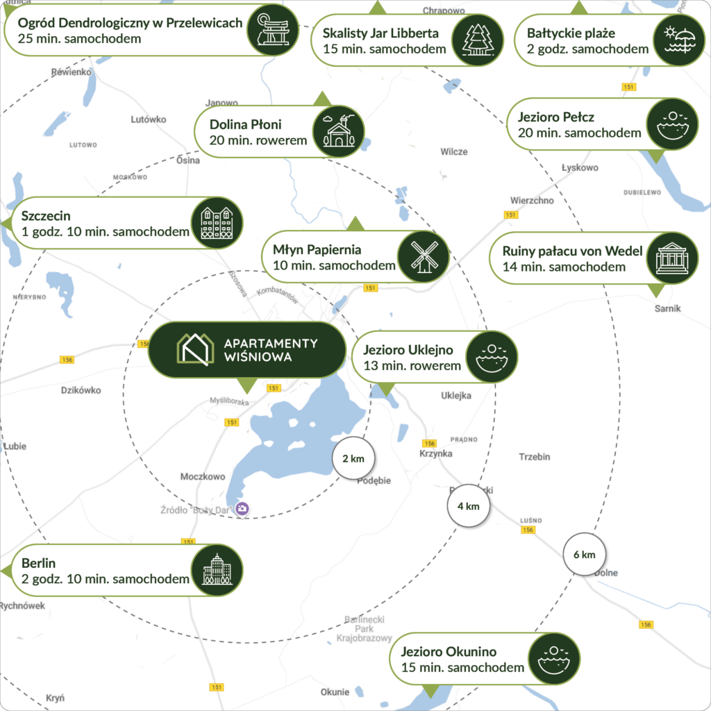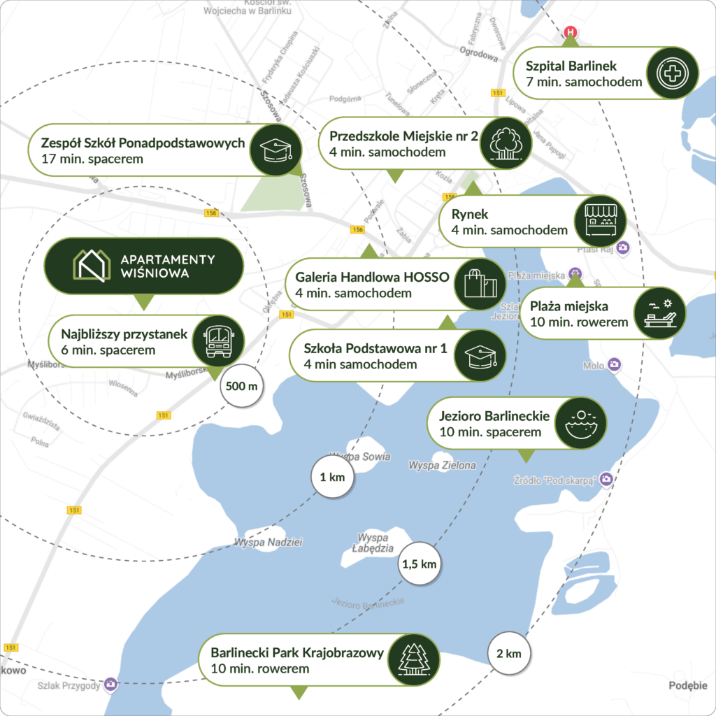 Apartamenty Wiśniowa zlokalizowane są przy ul. Wiśniowej w Barlinku – to malownicze miasto, znajdujące się w otulinie Barlineckiego Parku Krajobrazowego i położone nad brzegiem pięknego Jeziora Barlineckiego. Jednak naturalny urok tej okolicy nie jest jej jedyną zaletą. Bliskość drogi ekspresowej S3 oraz drogi wojewódzkiej nr 151 zapewni Ci szybkie połączenie z większymi ośrodkami – do Gorzowa Wlkp. dojedziesz w 30 minut, a do Szczecina w niewiele ponad godzinę. To miejsce, gdzie natura spotyka się z wygodą życia w niewielkim, ale doskonale skomunikowanym mieście.