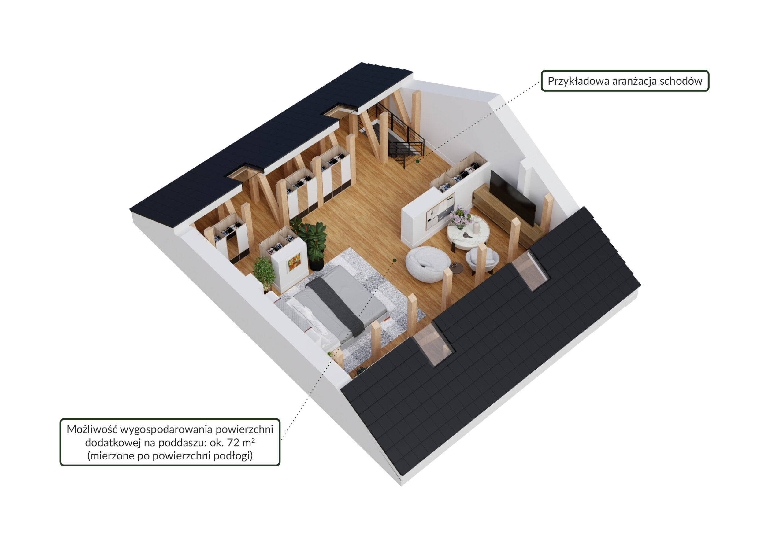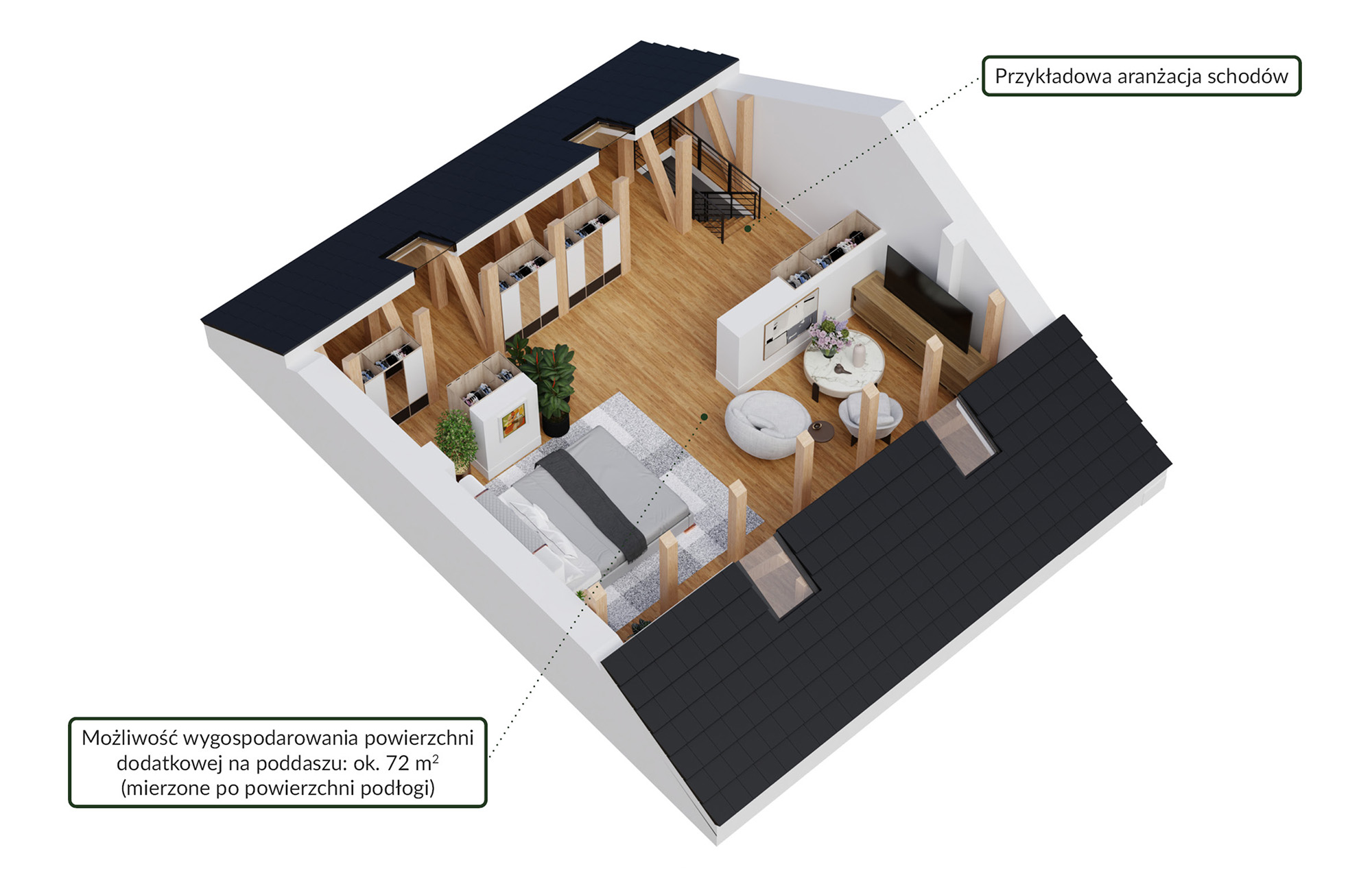 Kupując mieszkanie na piętrze zyskujesz dodatkowe metry kwadratowe powierzchni nieużytkowej, którą w razie potrzeby będziesz mógł we własnym zakresie dodatkowo zaaranżować np. na gabinet czy dodatkową sypialnię. Zmiany będą możliwe po uzyskaniu pozwolenia na użytkowanie. Konstrukcja stropu i dachu jest zaprojektowana w taki sposób, aby bezproblemowo zamienić wyłaz strychowy na schody, a w dachu zamontować dodatkowe okna połaciowe. Powierzchnia poddasza nieużytkowego po podłodze to ponad 70 m², co umożliwi Ci wygospodarowanie nawet ponad 35 m² dodatkowej powierzchni użytkowej.