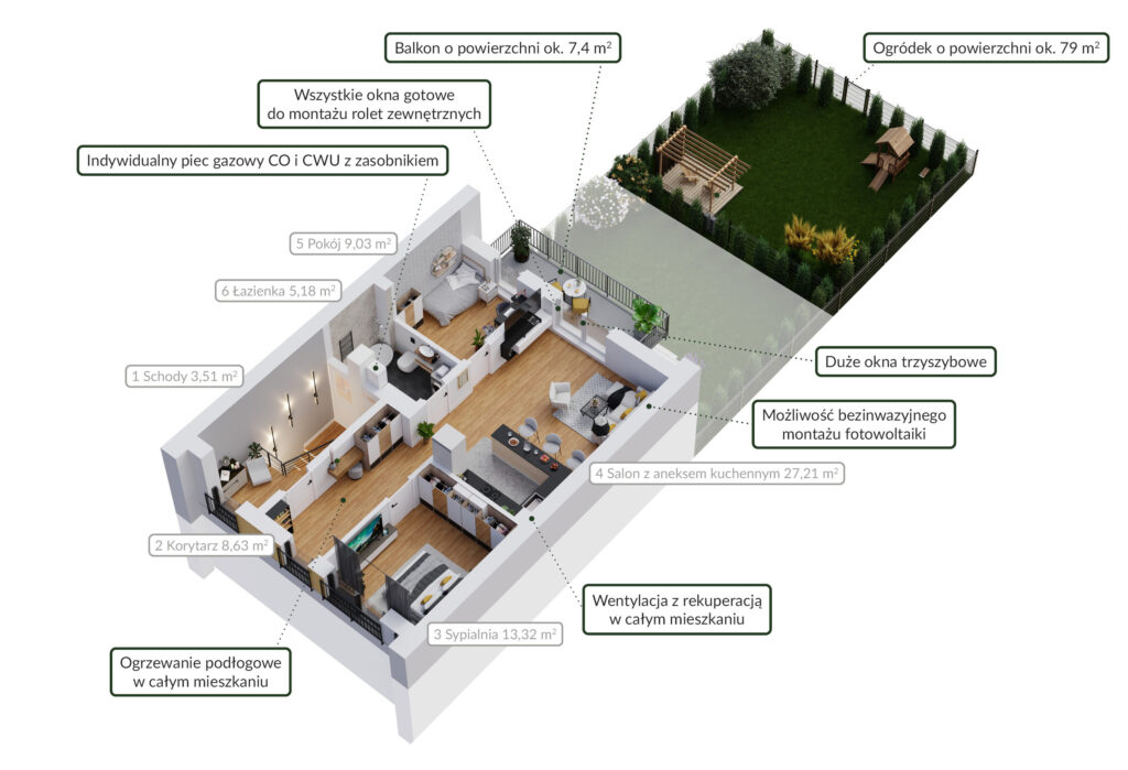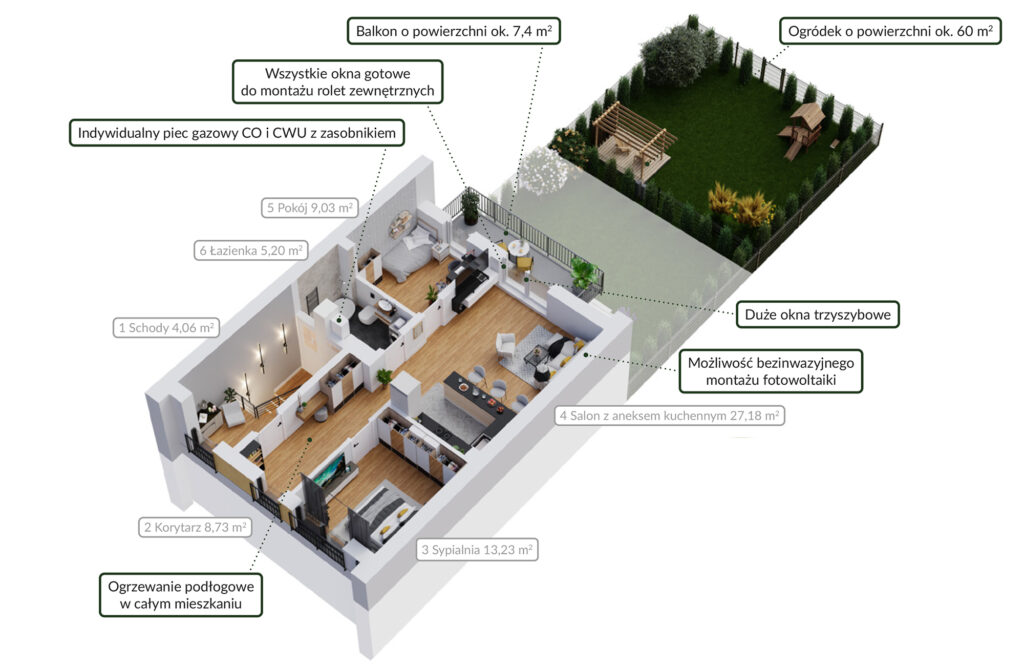 W przypadku zakupu parteru i piętra otrzymasz opcję łatwego połączenia obydwu mieszkań w jedno po oddaniu inwestycji do użytkowania. Dzięki przemyślanej konstrukcji budynku, połączenie nie wymaga skomplikowanych zmian konstrukcyjnych, co pozwala na szybkie i wygodne dostosowanie przestrzeni do własnych potrzeb. To rozwiązanie idealne dla dużych rodzin lub osób poszukujących przestronnego domu z dużym ogrodem i dodatkowym poddaszem.