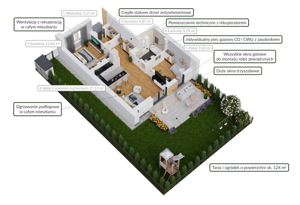 Apartamenty Wiśniowa wyróżniają się nowoczesnymi rozwiązaniami technicznymi, które zapewniają wygodę i oszczędność na co dzień. Ciepła płyta fundamentowa zaizolowana na całej powierzchni aż 15-centymetrową szczelną warstwą styroduru od spodu oraz 15-centymetrową warstwą styropianu podposadzkowego, gruba warstwa termoizolacji na elewacjach i trzyszybowe okna zadbają o ciepło zimą oraz przyjemny chłód latem. Budynki zaprojektowano ponadto z ciepłych bloczków z betonu komórkowego, co dodatkowo pozytywnie wpływa na parametry termoizolacyjności ścian zewnętrznych. Wentylacja mechaniczna z rekuperacją zadbają o czyste powietrze i oszczędność energii. Wysoki komfort termiczny zapewni Ci także ogrzewanie podłogowe na całej powierzchni apartamentu. Ponadto wyeliminowano możliwość powstania mostka cieplnego na styku ściany z balkonem, poprzez zastosowanie innowacyjnych termicznych łączników balkonowych. Wszystkie te nowoczesne rozwiązania uzupełnia dbałość o akustykę – oddzielone podwójne ściany pomiędzy segmentami oraz specjalnie zabezpieczona przed przenoszeniem dźwięków klatka schodowa lokalu na piętrze. Całość dopełniają m.in. wysokiej jakości dachówka, drenaż opaskowy, starannie przemyślane i wykonane izolacje przeciwwilgociowe, rolokasety nad oknami oraz przepusty ścienne i dachowe umożliwiające bezinwazyjny montaż fotowoltaiki, pompy ciepła, ładowarki EV czy klimatyzacji we własnym zakresie.
