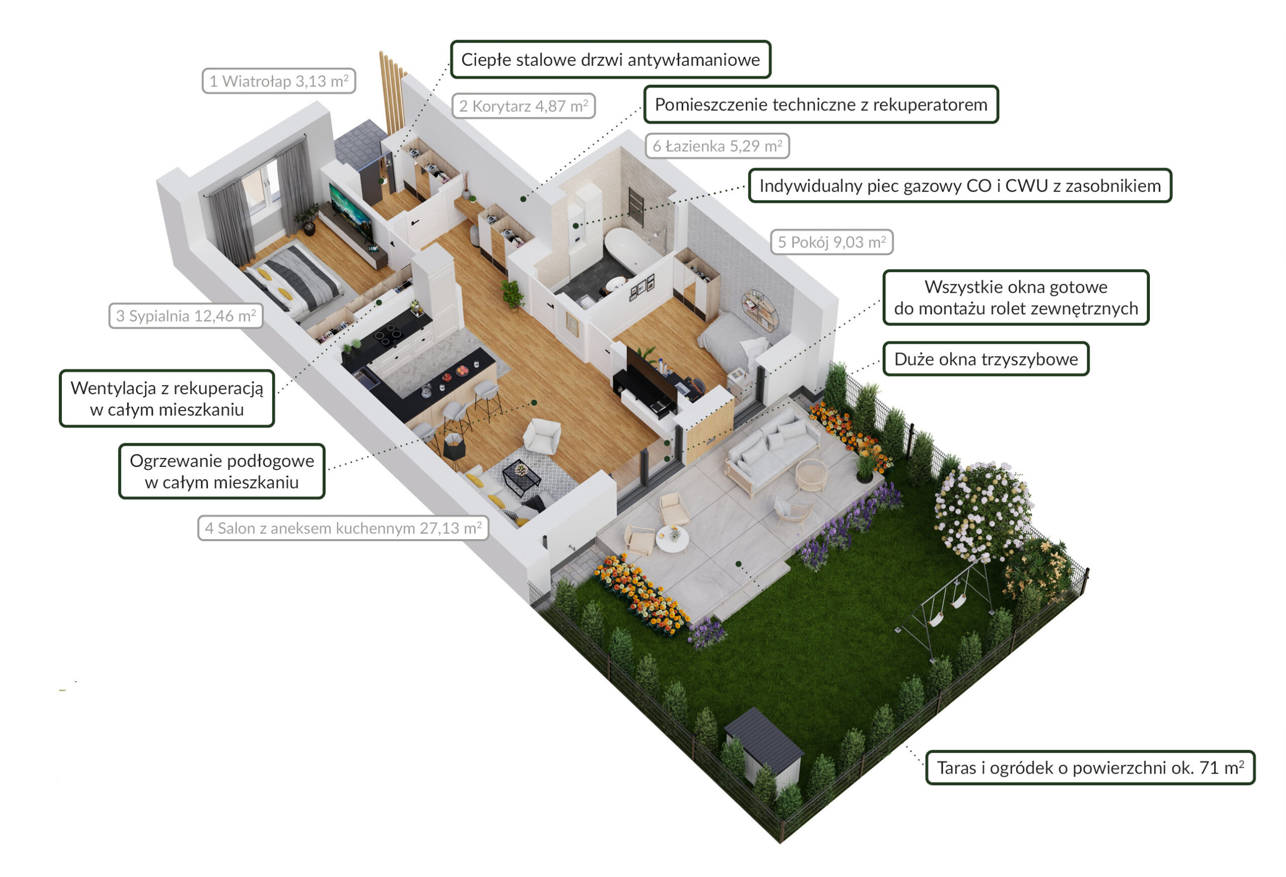 Indywidualny ogród przynależny do każdego apartamentu (także tych na piętrze)