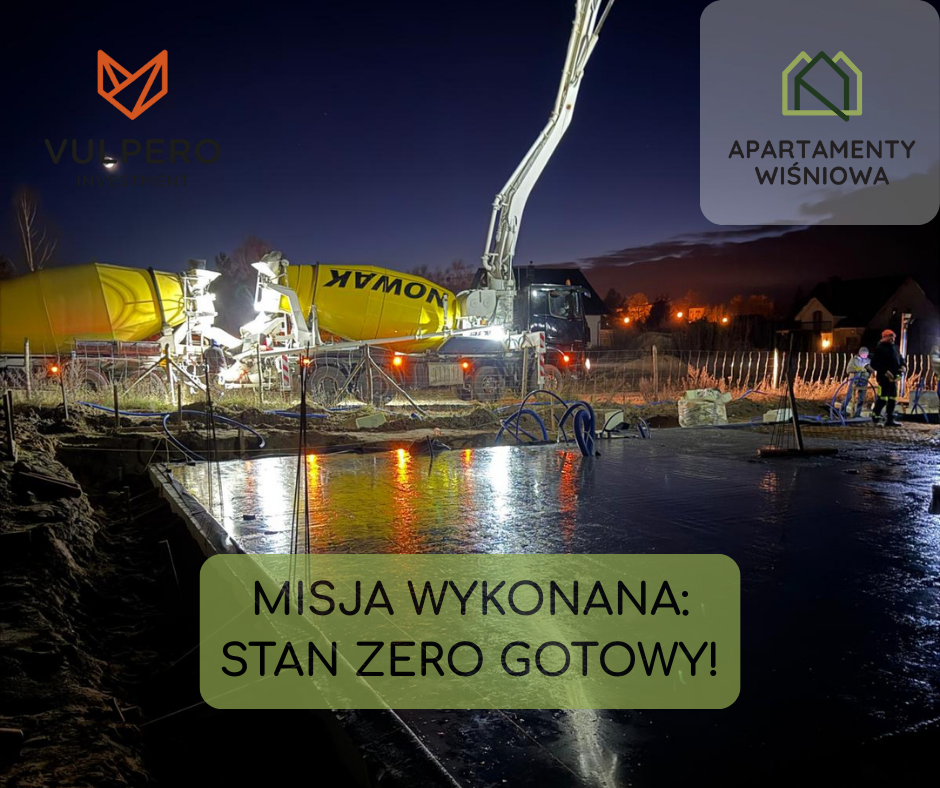 Mamy to! Z ogromną satysfakcją informujemy, że jeszcze przed pierwszą Gwiazdką i nadejściem silnych mrozów, sfinalizowaliśmy kluczowy etap budowy – stan „zero” – dla Etapu I inwestycji Apartamenty Wiśniowa.