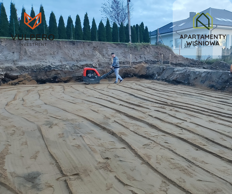 - Solidne podstawy (Wymiana gruntu): Nie chodzimy na skróty. Dokonaliśmy pełnej wymiany gruntu na głębokości do 2 metrów, zastępując go starannie zagęszczonym kruszywem. To gwarancja stabilności konstrukcji budynków.